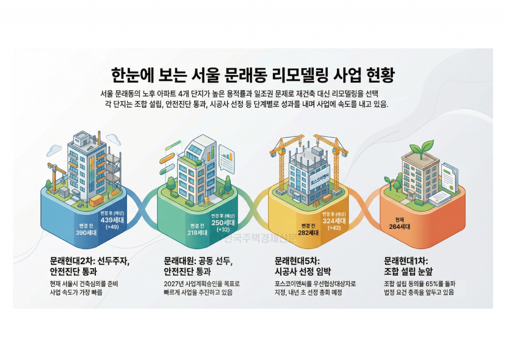 문래대원아파트가 문래현대2차와 선두권을 형성하면서 비슷한 속도로 사업을 진행하고 있습니다. 10월 31일 안전진단을 통과하고, 사전자문 통과에 박차를 가하고 있습니다. 조합은 내후년 사업계획승인까지 목표로 두고 있습니다. 현재 사전자문, 건축심의를 위한 대부분의 업체 선정을 마쳤고, 내년 사전자문, 건축심의를 거쳐 내후년에는 권리변동계획 수립 총회, 사업계획승인 신청까지 목표로 추진하고 있습니다. 문래대원 리모델링 이세종 조합장은 “문래동 일대는 노후 주거지가 많고 대규모 신축 단지 부재 등의 이유로 저평가된 경향이 있다”며 “하지만 우리 안양천변 리모델링 사업장들을 비롯해 문래동 일대 정비사업이 활발하게 진행되고 있어 학군 개선, 인프라 공유 등 시너지 효과가 기대된다”고 말했다. 이어 “우리 단지가 입주할 때쯤이면 양평역 자이 디그니티, 문래진주 재건축, 문래동4가 재개발 등이 완료되면서 주변 생활여건이 대폭 개선될 것”이라고 전망하였습니다. 자세한 내용은 하단 관련기사 링크를 통해 확인하실 수 있습니다. 출처 : 위클리한국주택경제신문(http://www.arunews.com)https://www.arunews.com/news/articleView.html?idxno=51777